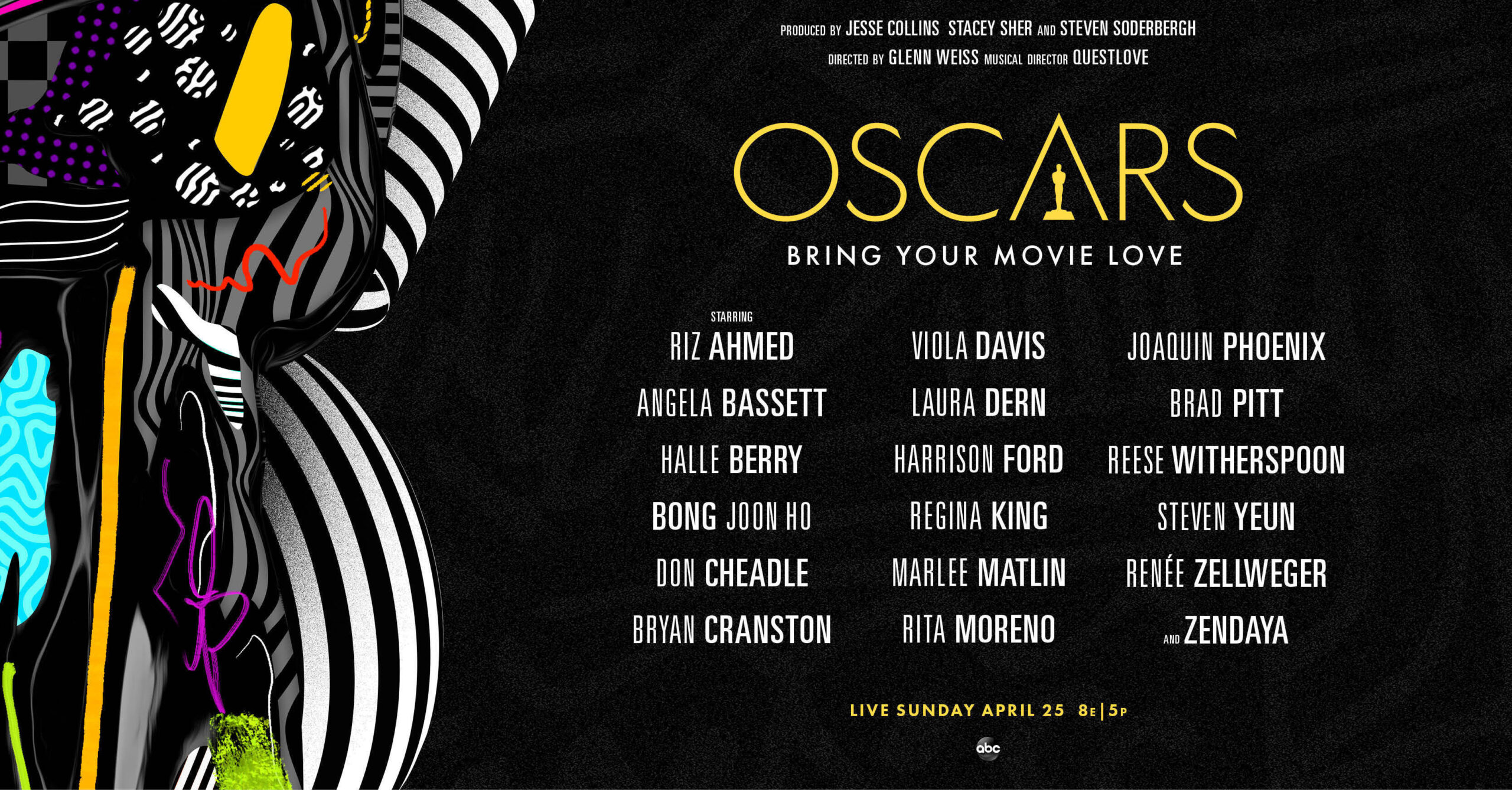 The previously announced lineup includes Riz Ahmed, Angela Bassett, Halle Berry, Bong Joon Ho, Don Cheadle, Bryan Cranston, Viola Davis, Laura Dern, Harrison Ford, Regina King, Marlee Matlin, Rita Moreno, Joaquin Phoenix, Brad Pitt, Reese Witherspoon, Renée Zellweger and Zendaya.