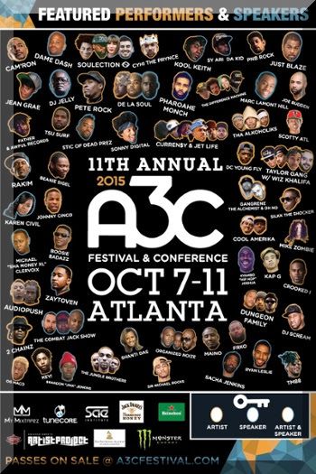 2015 A3C Festival & Conference presenting partners currently include: MyMixtapez, Monster Energy, SAE Institute of Atlanta, Morehouse College, Mail Chimp, Tunecore and Sonicdbids.